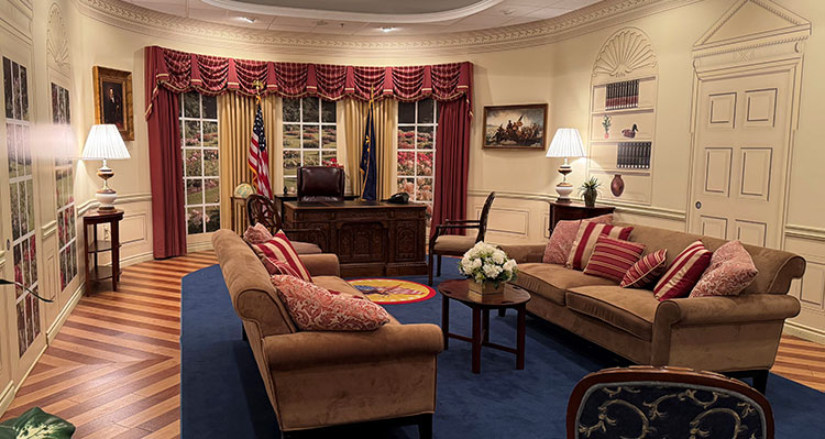 One of the most identifiable pieces in the Oval Office is a smaller version of the Resolute Desk. The wood flooring replicates the same pattern that exists in the actual Oval Office. The three dimensional wallpaper gives the impression of being able to step out into the Rose Garden.
